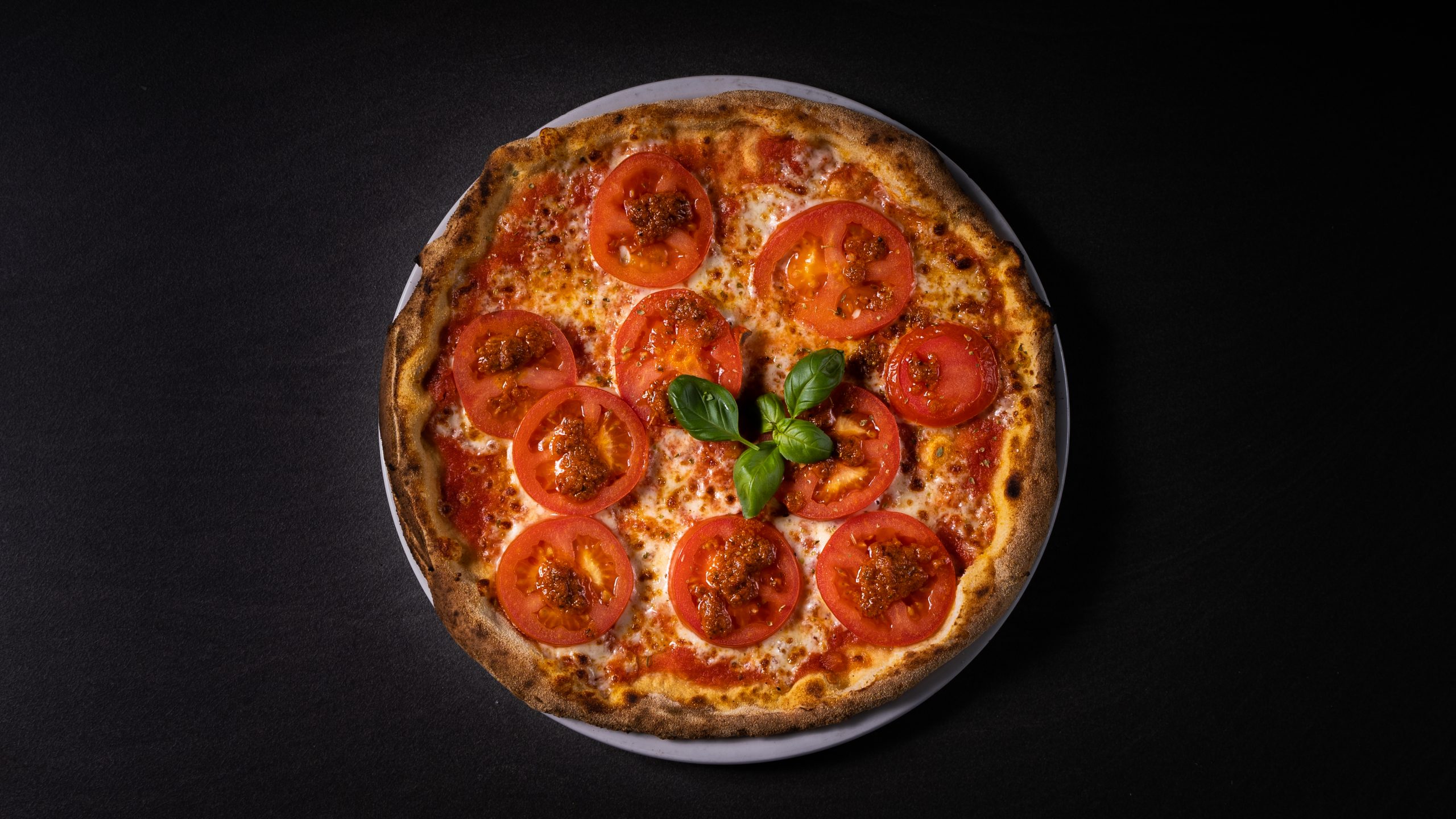 Bio-Dinkelteig, Bio-Tomatensosse, mit frischen Tomaten, Trüffelpesto und Basilikum, Oregano